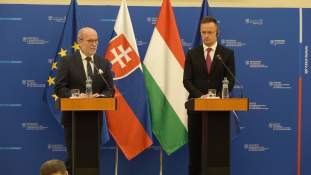 Rastislav Káčer szlovák és Szijjártó Péter magyar külügyminiszter pozsonyi találkozójukat követően tartott sajtótájékoztatót.